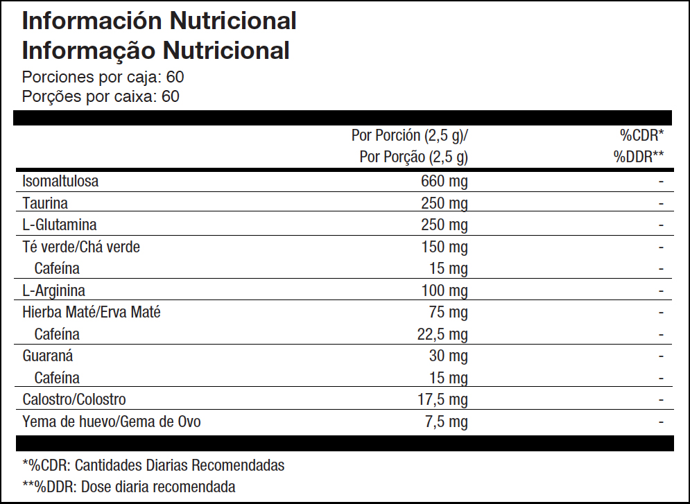 Isomaltulosa†, corrector de acidez (ácido cítrico), L-glutamina, taurina, sabor a frambuesa, sabor a vainilla, extracto de hojas de té verde (Camellia sinensis L. Kuntze), L-arginina, sabor a fresa, extracto de hojas de hierba maté (Ilex paraguariensis A. St.-Hil), sabor a arándano, agente antiaglomerante (dióxido de silicio), colorante (rojo de remolacha), edulcorante (sucralosa), extracto de granos de guaraná (Paullinia cupana Kunth., Bonpl. et Kunth), colorante (carotenoides), calostro, potenciador del sabor (acetato de sodio) y yema de huevo.